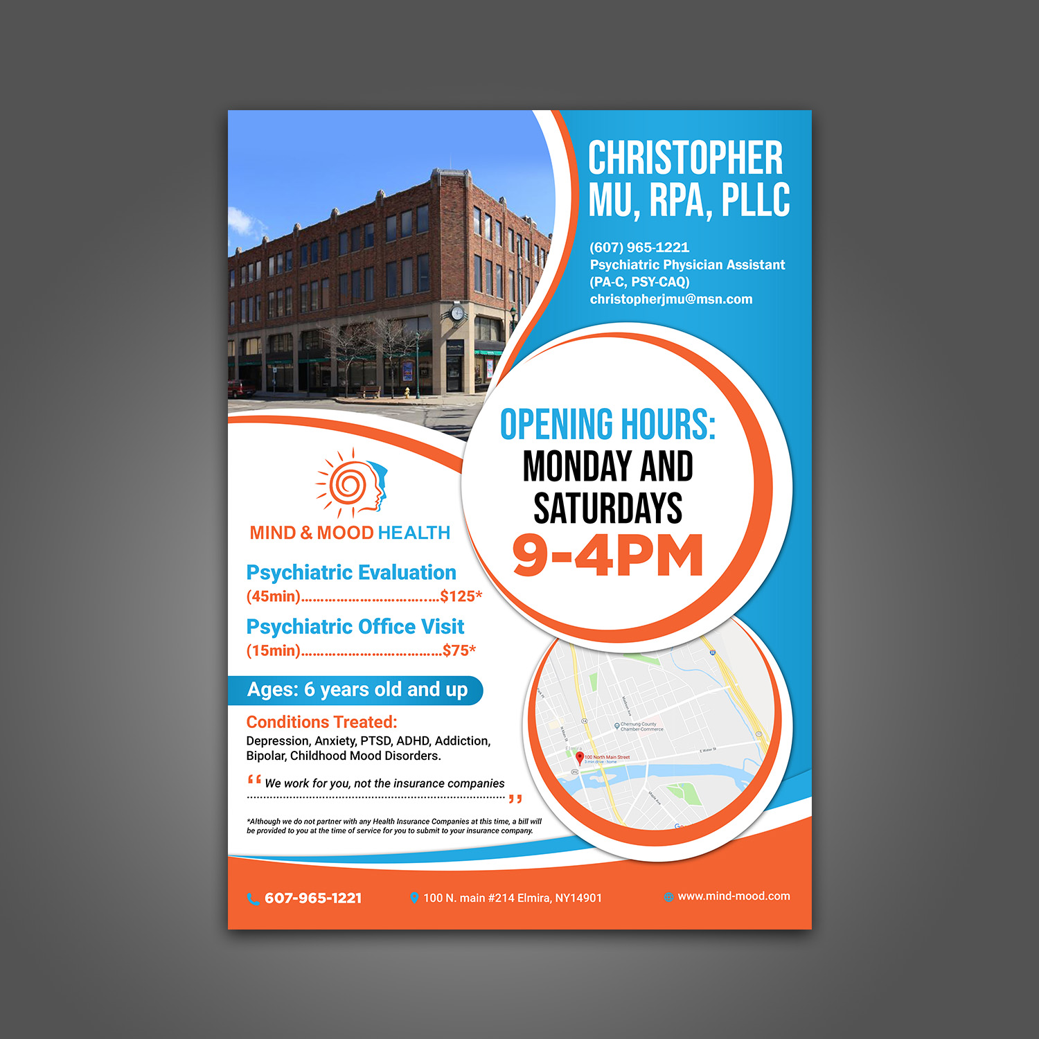 aspiremedia, un Indian designer, created this Professionnelle, Doctor flyer on 11th April, 2019 for Psi Psychiatry, une entreprise à United States. The flyer was designed for the project 'Mind and Mood Health Flyer (new business startup)'.