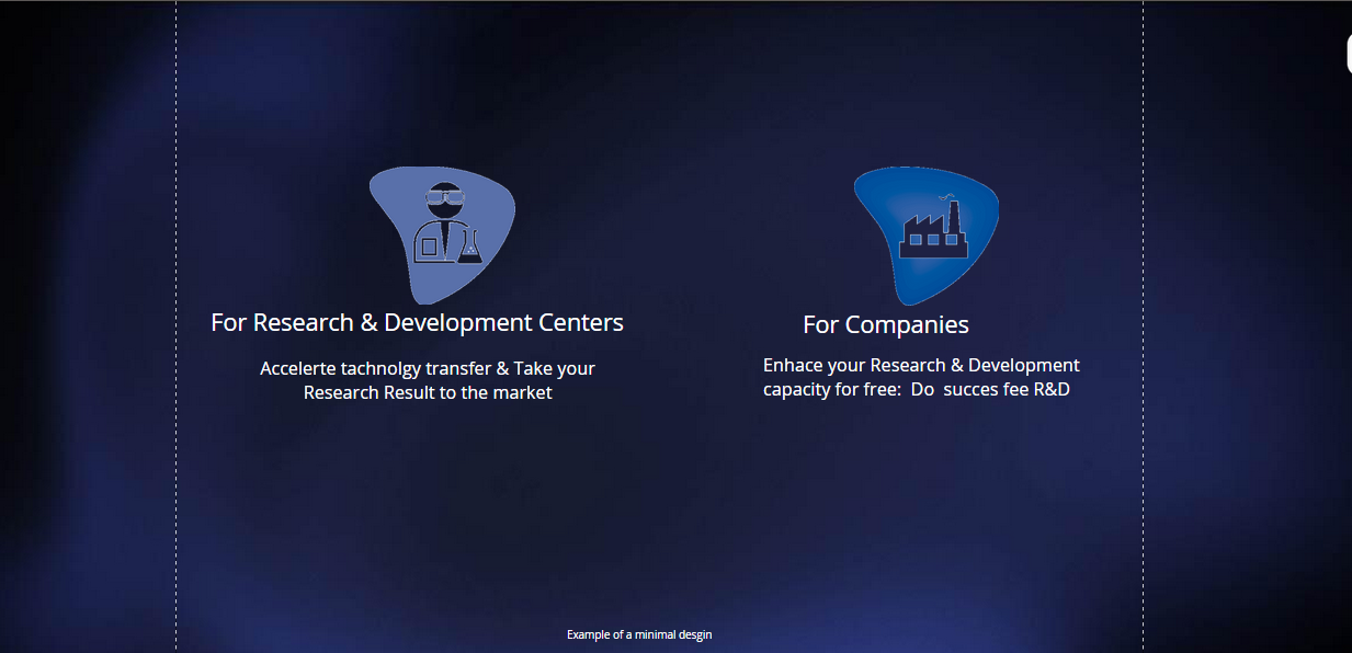 The main page needs to focus on the players in the market pace: Side Sellers of technology: Research & Development Centers Side Buyers of Technology or Solutions: CompaniesSee the following picture as an example of a scheme of what should focused the landing pagehttp://screencast.com/t/fN3daffa Added Saturday, September 5, 2015