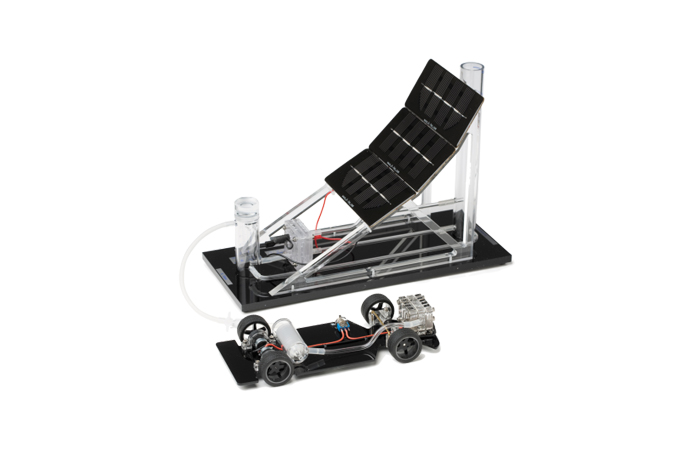 Our most realistic model car set gives observers a glimpse of the transportation technology of the future. The gas station uses solar power to run an electrolyser and produce hydrogen gas. This gas then feeds the air-breathing double fuel cell on board the car, producing electricity and driving the car forward. One tank of hydrogen produces enough power for a 7-minute run time.