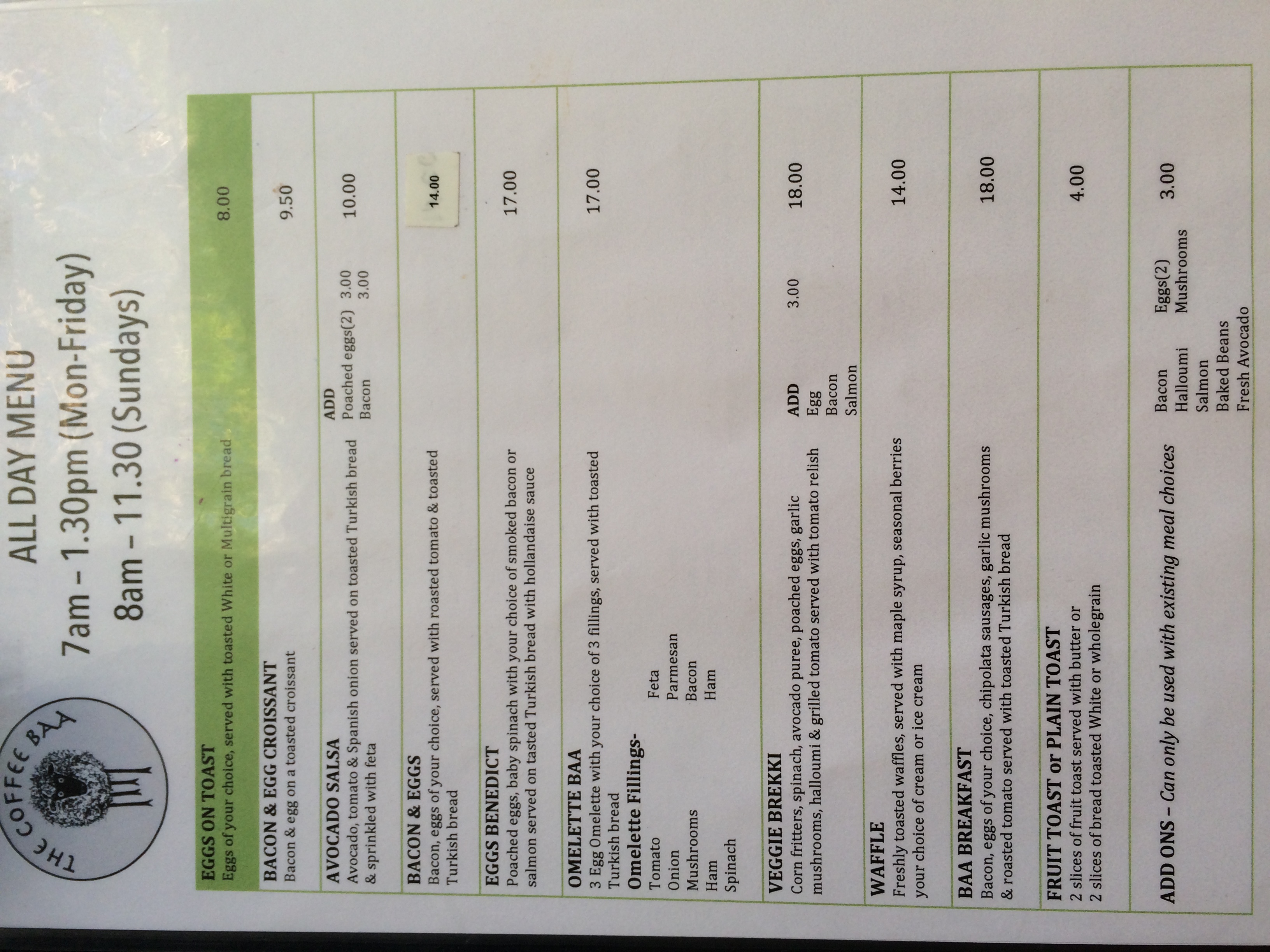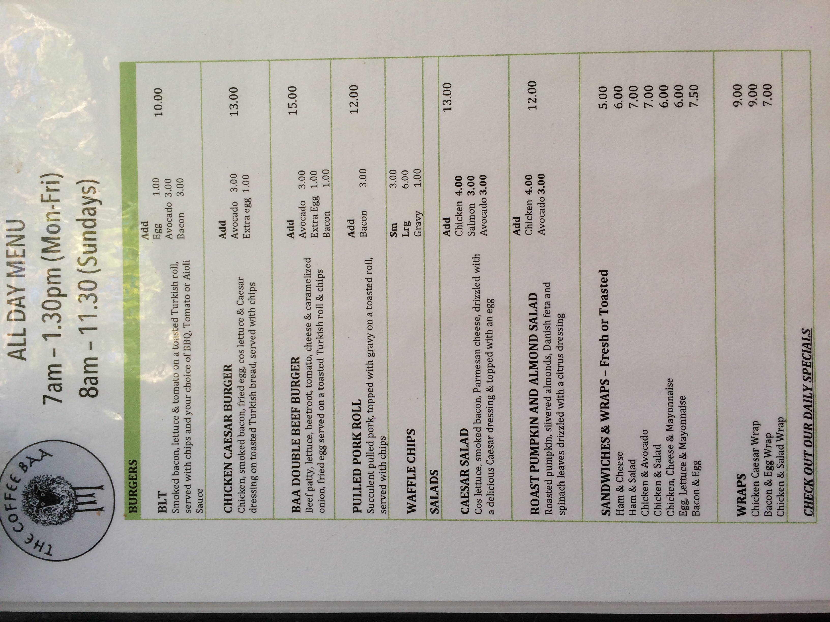 I need to design a new menu for a small cafe called The Coffee Baa. I've attached pictures of the old menu to give an idea, I really want a completely new look though. You'll notice that the food, coffee and drinks are currently on separate menus, I want all of this to be on one menu. We want to add images of the food before we print the menu, so ideally you will leave spaces for images of the food.