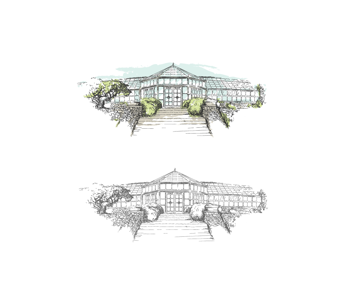 The file needs to be a vector, made in Adobe Illustrator. Please include some of the landscaping. Ideally it would be a black and white sketch with the colors dropped over in a watercolor style.