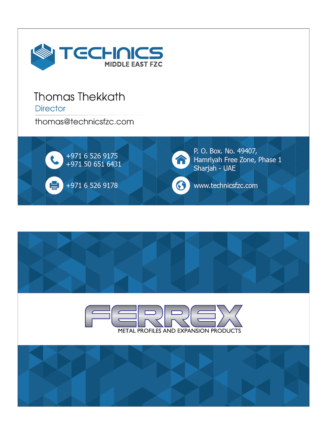 - my have the blue hex design somewhere. Should have company name at top, "TECHNICS MIDDLE EAST FZC" with logo, picture attached. Then should also include brand name somewhere, " FERREX METAL INDUSTRIES". Must have list of products. List 1 Title : Drywall partitions & ceiling systems, under the list in bullets should include, Stud & Track, Furring Channel, Main Channel, wall angle, Board Channel, Aluminum perforated & non perforated tiles. List 2 title: Expanded mesh & Metal products, under the list in bullets should include, Angle Bead, Plaster stop bead, Architrave Bead, control joint bead, movement bead, render stop bead, Metal Lath, Brick Mesh, Ladder Mesh, Steel Lintel, Wall ties and fiber glass reinforcing fabric. Should also have some pictures of the products.