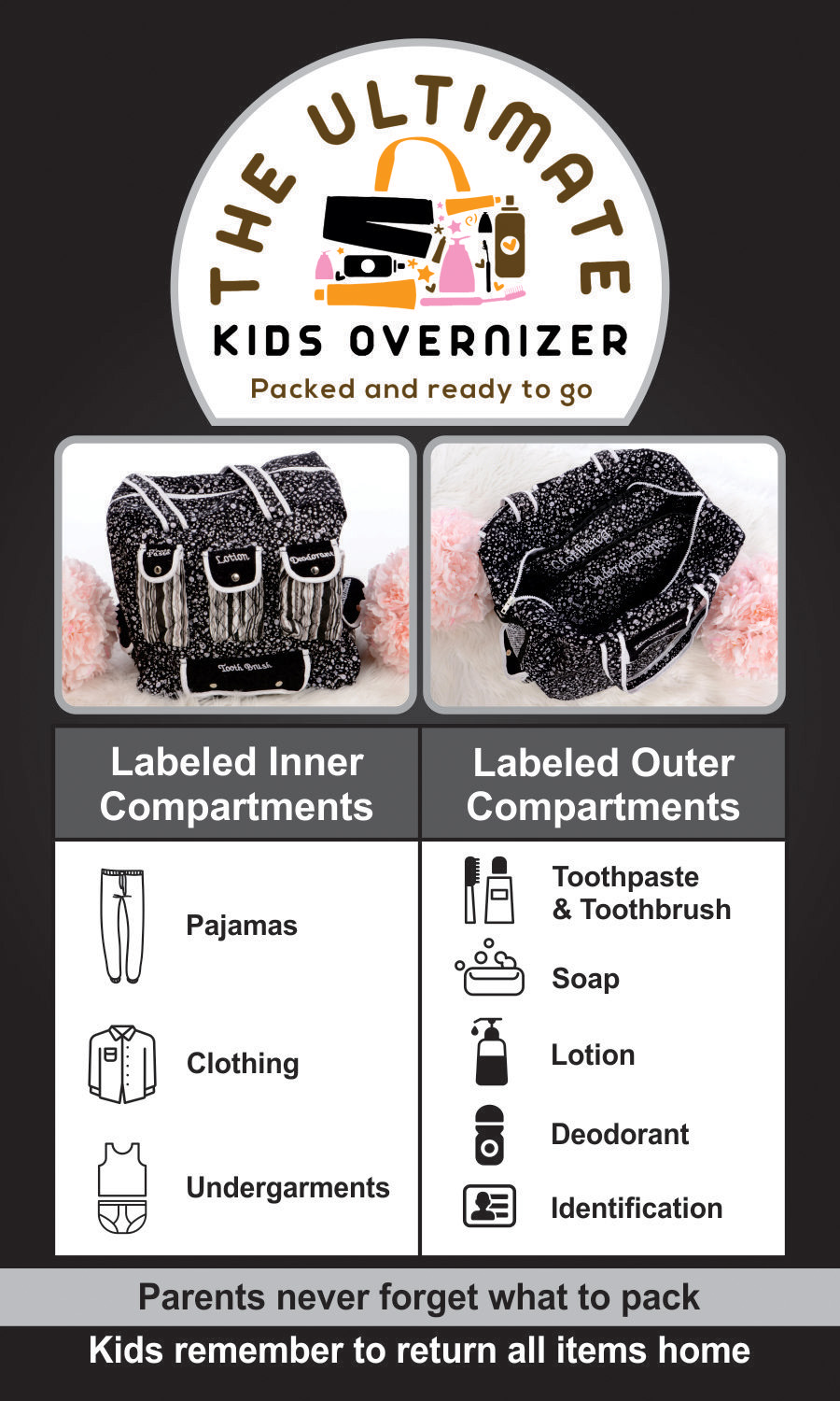 - - The paragraph info on the right bottom should say "prepare your kids for overnight stays with this highly organized, labeled, overnight bag. Outer compartments for all the essentials. Inner compartments for pjs, undergarments, and clothing. Rear identification tab. Never forget what to pack and remind kids to return all items home!