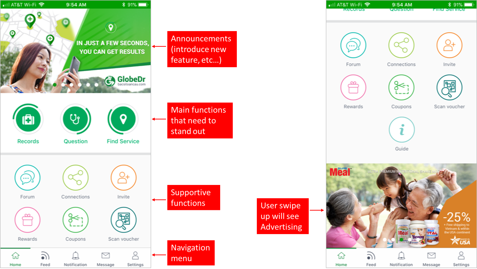 We need a home page design that is attractive, and simple to navigate for our mobile app. This app helps people maintain their personal health records, find and connect with care providers to ask question, get care online or face to face through appointment. It also has a few other features to encourage engagement such as Forum, Reward, Service Discount Coupon.