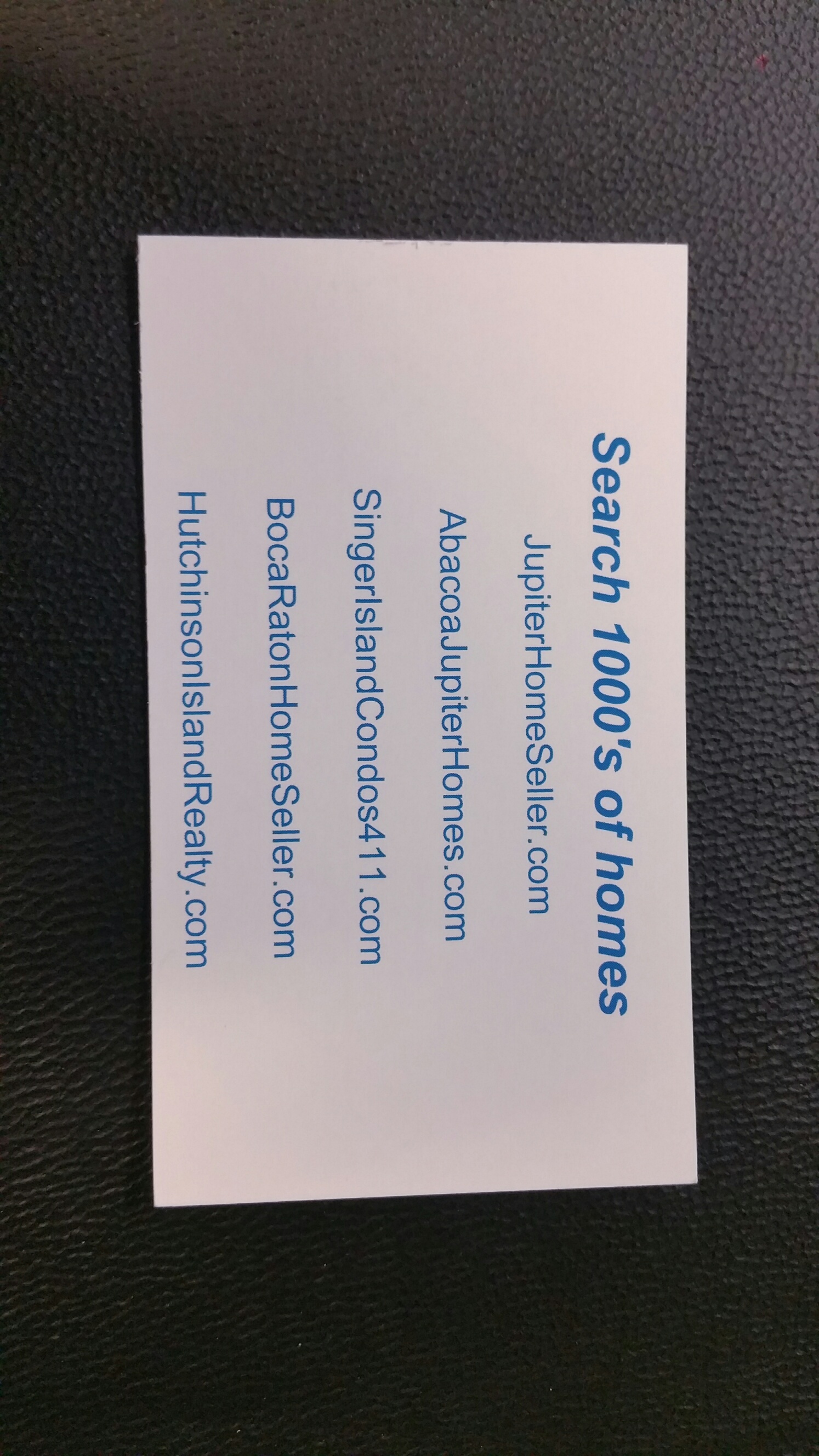 - 2- back of card websites listed with Jupiter1oceanfront.com being first listed followed by SingerIslandCondos411.com, AbacoaJupiterHomes.com, HutchinsonIslandRealty.com, BocaRatonOceanCondos.com