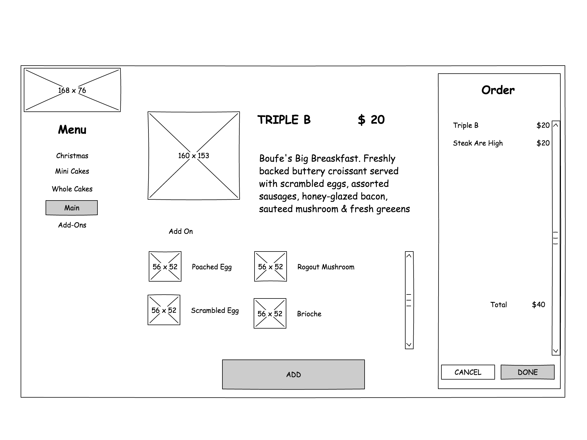 Page 2. Item Detail/Description Page. Shows description of the food, and its available Choice(other food items or Special Request, up to 12) will also be displayed. 'Add item to cart' action(Button Name: ADD) will happen here and go back to Browsing Page 1.