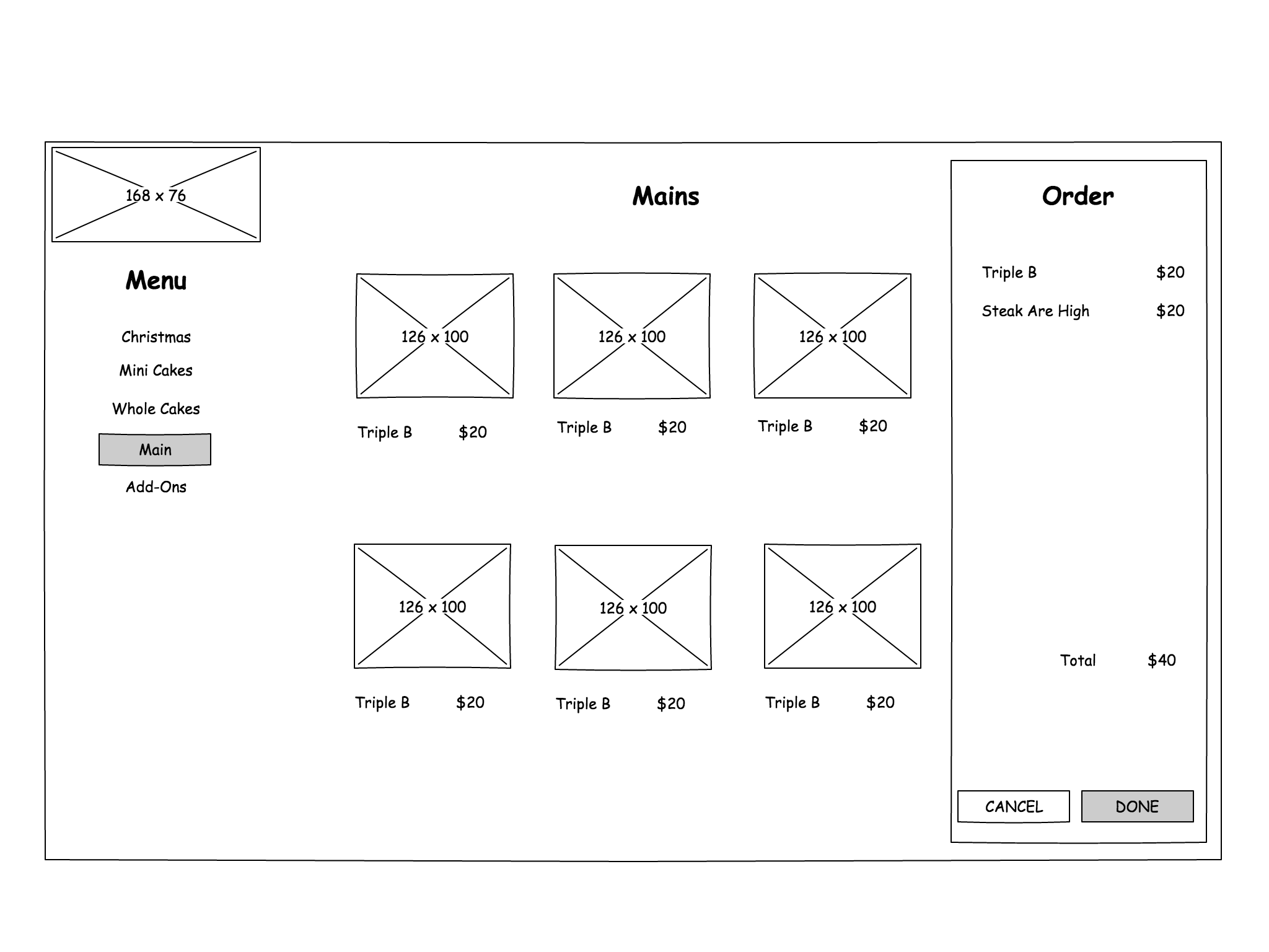 Page 1. Food Browsing Page. displays all food images(to be provided by cafes) by categories, and displays the Cart. This page will lead to Page 2 or Page 3.