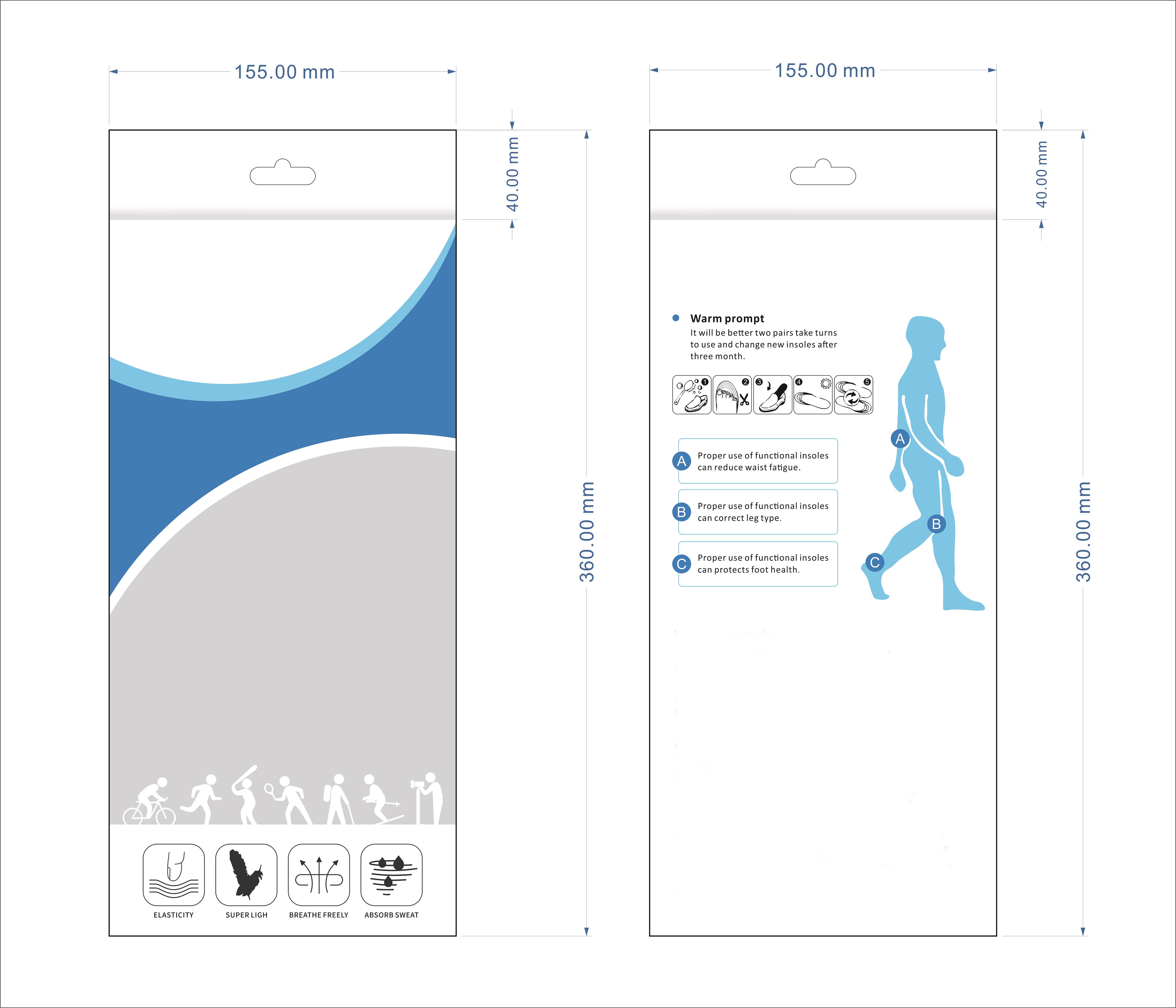 I need fresh and new desing for this packaging. This packaging is for insoles that reduce weight and price (the product does not affect sports or athletes) The packaging must be in 4 colors: white / black / light green: ecffeb / dark green: 54c248 green need to be used soft (and gray for transparency) .The size is the same to the sample packaging the front panel: - it must contain my logo in the top - icons like the example. - A design above the 4 icons (like a) but not on the sport, you can use daily situation (walk the dog, walk for ... The back side Part 1 - it must contain my logo in the top - this text must be included: 1: "promote to lose weight" 2: "Increases blood flow and oxygen in your body" 3: "Relieves muscle and joint pain "4:" Increases energy and stress stress "with one to two numbers (1 of 2) : cut out your insole 3: insert your insole into your shoes 4: clean only with water Footer - include this type icons (like example)