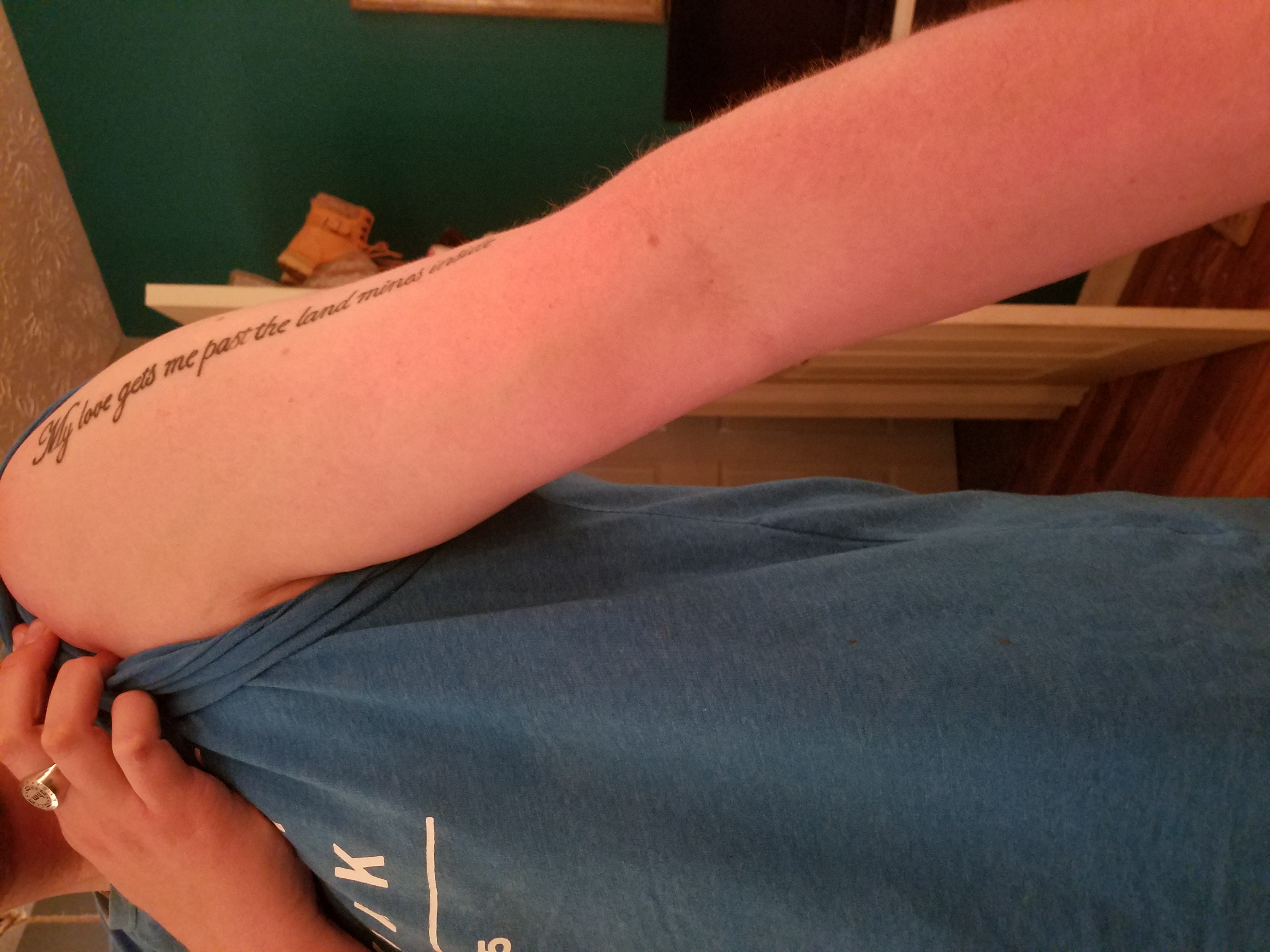 I have a verse from me and my wifes song from my shoulder down to within about 3 inches of my elbow. The words are only about 3/4 in wide. I want a clock and maybe another design to remember her by. The clock should be in the 8:08:18 position, the date she left this earth. The verse is "my love gets me past the land mines inside" straight down the middle of my arm visible with arms to my side, NOT on my biceps or triceps. If you need more info let me know. Some ideas I like are at http://www.menstattooideas.net/clock-tattoos-for-men/I thought about somthing starting on my shoulder so it doesn't obstruct the verse, but I'm open to anything on the same arm as the verse.