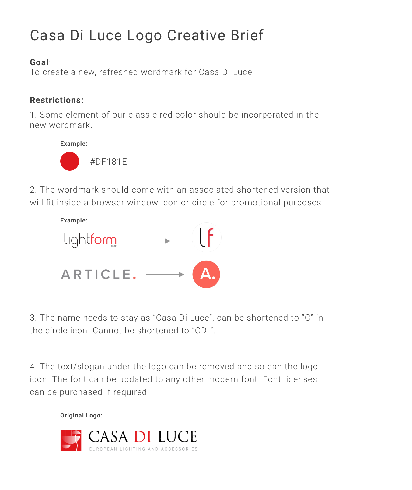 New, refreshed word mark for Casa Di Luce - Luxury Lighting salon. Elements of #DF181E - our classic color. Must look good in black in white. Word mark may have an associated shortened version (shorten to C, but not CDL). Slogan and icon from old logo may be removed. Please see detailed brief attached.