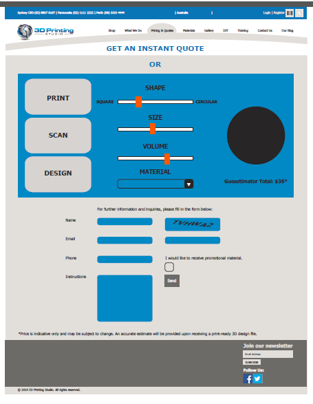 We are in the process of redesigning our website. Attached is an image of one of the proposed pages - "The Guesstimator". The idea with this page is that site visitors can get an indicative estimate of the cost of 3D Printing based on some provided metrics. When the user alters the metrics the price changes accordingly. We are looking for a design to support this page that will also be used across our site.